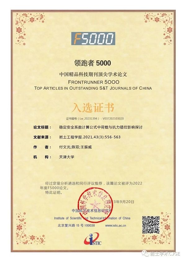中國科學(xué)技術(shù)信息研究所發(fā)布了《中國科技期刊引證報告2023年(核心版)》,其中,總工程師付文光2021年以第一作者發(fā)表在《巖土工程學(xué)報》的論文《穩(wěn)定安全系數(shù)計算公式中荷載與抗力錯位影響探討》,被評選為“中國精品科技期刊頂尖學(xué)術(shù)論文”(F5000)。