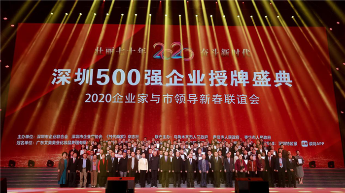 2019年12月10日,由深圳市企業(yè)聯(lián)合會、深圳市企業(yè)家協(xié)會、《時代商家》雜志社主辦的“深圳500強企業(yè)授牌盛典暨2020企業(yè)家與市領(lǐng)導新春聯(lián)誼會”在深圳灣體育中心“春繭”體育館舉行。深圳市人大常委會主任駱文智,市政協(xié)主席戴北方,中國企業(yè)聯(lián)合會、中國企業(yè)家協(xié)會常務(wù)副會長兼理事長朱宏任,深圳市委常委、統(tǒng)戰(zhàn)部部長林潔,副市長王立新及省市老領(lǐng)導等出席了盛典,并為“2019深圳500強企業(yè)”和“2019年度深圳市民營領(lǐng)軍骨干企業(yè)”授牌。
